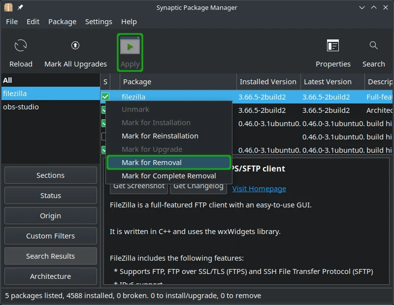 You should be extra careful when deleting packages. Make sure you know what you are removing and do your research to ensure it's safe. If, for example, you just installed OBS Studio, and you are now going to remove it, you can be quite certain there should be no issues. If, on the other hand, you see a package like libxnvctrl0 and you didn't install it, don't remove it - you will likely break your system.
