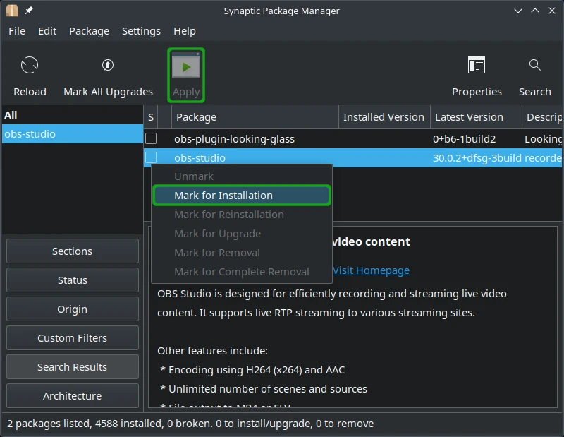 Synaptic shows all available and installed Debian packages. Because most installed apps are Debian packages, we suggest you start with this tool. Enter sudo -E synaptic into a terminal to run it with the same theme as your desktop. It should be installed by default, but if need to reinstall it for any reason, enter sudo apt install synaptic into a terminal.