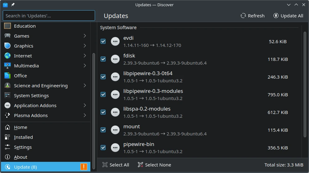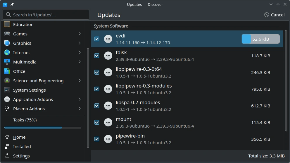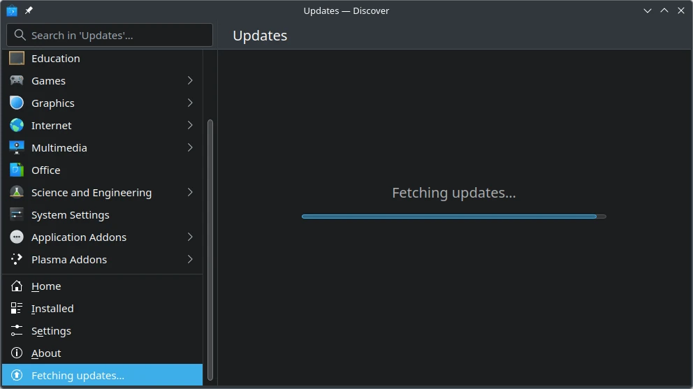 Another way to update packages is to open Discover and then select "Updates" in the bottom-left corner of the app. Then return to the second step above.
