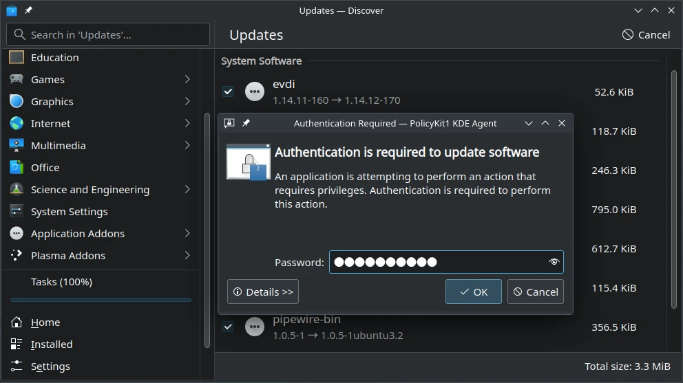 While it is possible to use other graphical tools to update packages, we recommend using the default Discover Updater because it notifies users of updates and handles the process correctly and easily for both Debian and Flatpak packages.