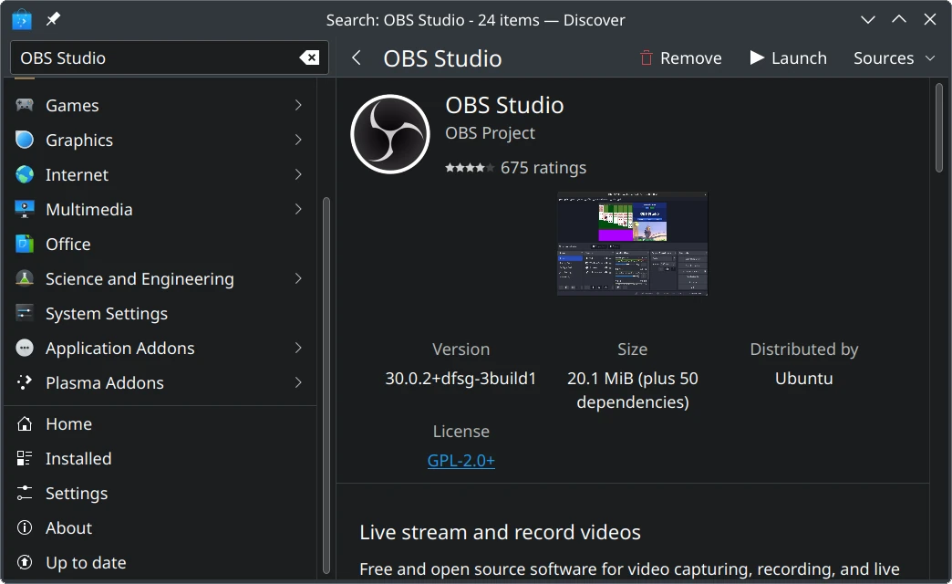 We recommend using Discover if you want to remove a Snap or Flatpak. Discover will also show many Debian packages that have AppStream metadata. But, as discussed earlier, it will NOT show many other Debian packages that are missing this metadata, typically libraries and 3rd-party apps.